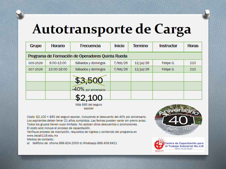 Verifique que cumple con los requisitos de inscripción: •Saber leer, escribir y tener 21 años cumplidos. •Acta de nacimiento, CURP, comprobante de domicilio, comprobante del RFC, identificación oficial y licencia de conducir de un Gobierno Estatal. •Saber manejar estándar •Comprobante de pago. •Cubrir seguro escolar