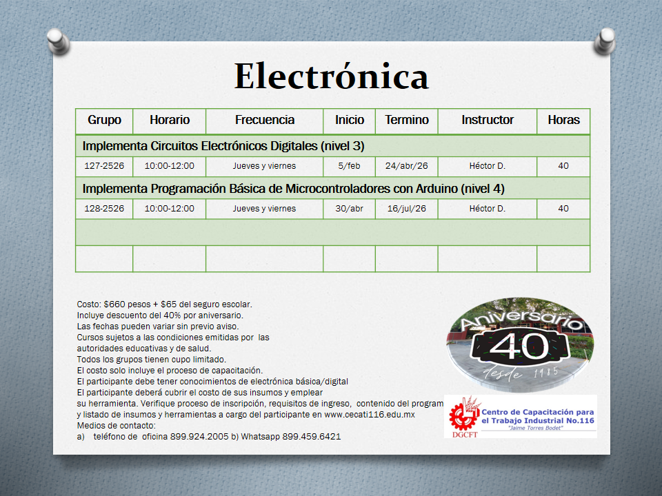 En la actualidad una buena parte de los equipos que nos rodean contienen circuitos electrónicos, sea en la casa o en el trabajo; esto debido al avance tecnológico y las comodidades que conlleva. Por ello, este programa permite a una persona sin conocimientos de electrónica, después de un año de estudio, el realizar trabajos de diagnóstico y reparación de diversos aparatos electrónicos, siendo la base para los campos de la ingeniería en ámbitos electromecánicos, como la robótica, lo que permitirá al egresado abrir un negocio o buscar un empleo.