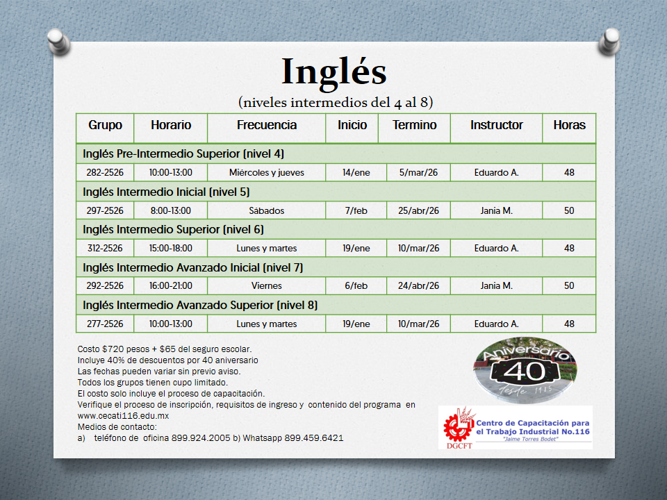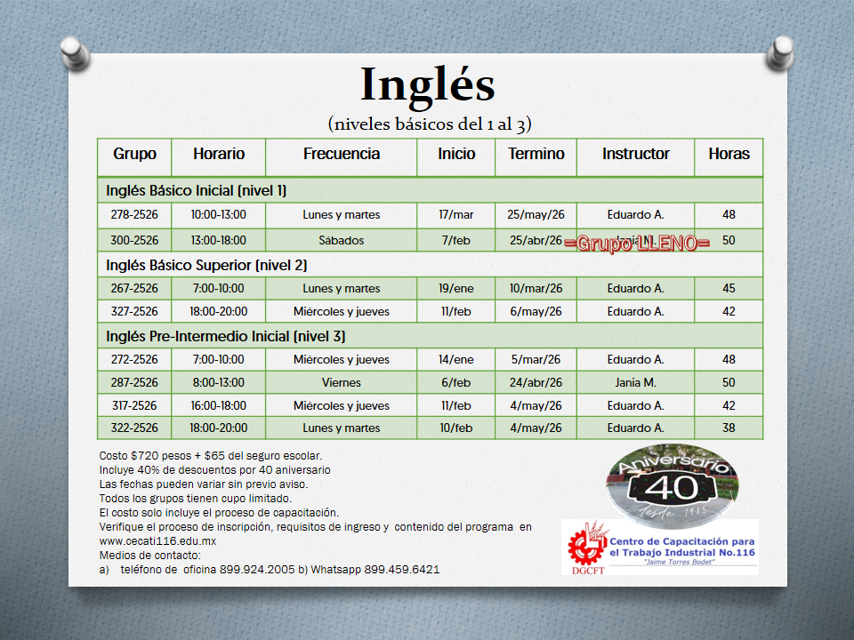 El inglés es el idioma económico internacional y una herramienta para un mejor empleo, así como una necesidad en el ámbito familiar y turístico, en nuestra región. Este programa desarrolla las 4 habilidades lingüísticas: la expresión oral, la comprensión auditiva, la expresión escrita y la comprensión lectora. Además no vendemos libros u otros materiales, TODO esta incluido.